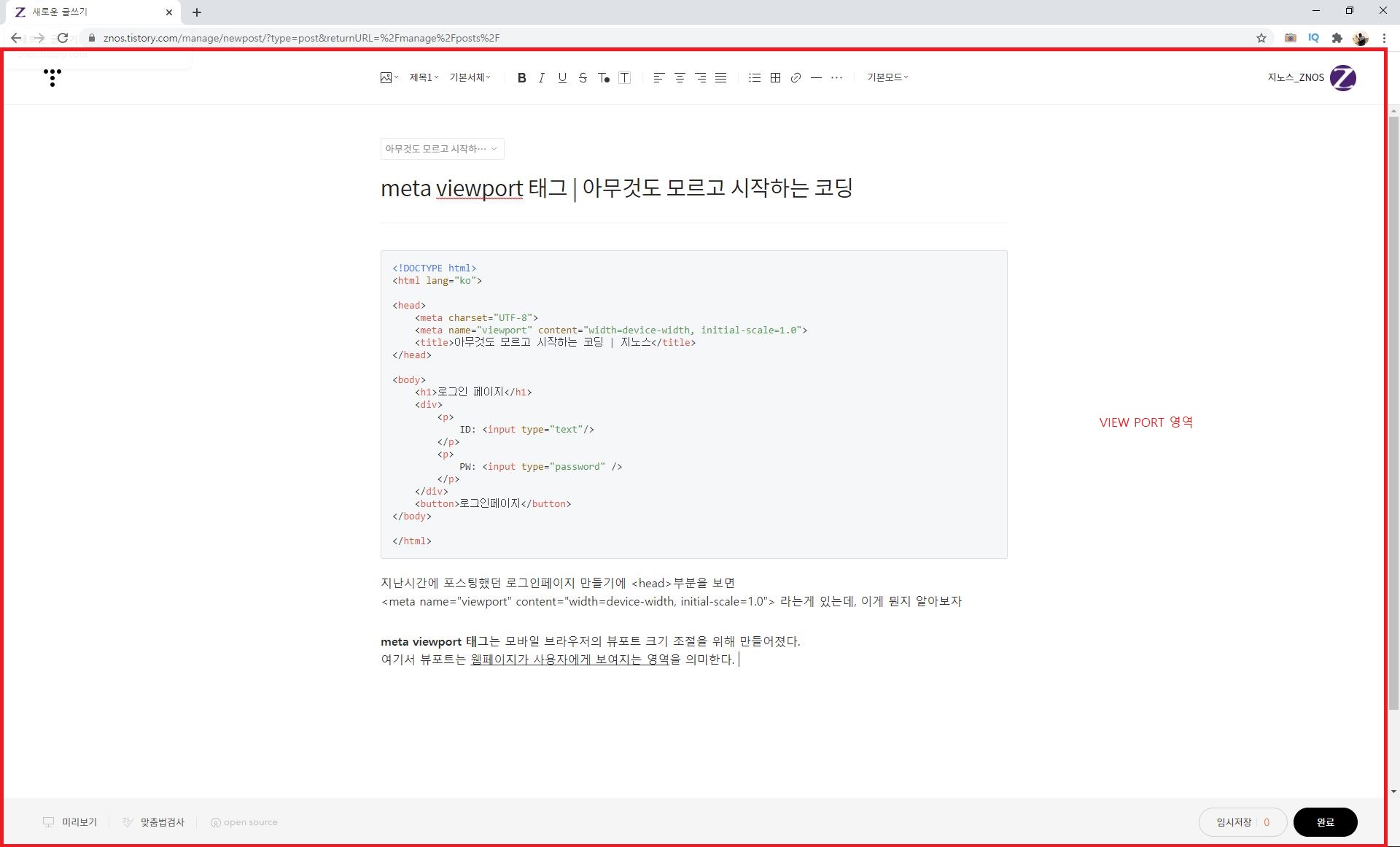 뷰포트의 너비를 장치너비로 하고, 스케일을 1.0(100%)로 하는 코드를 적용한다