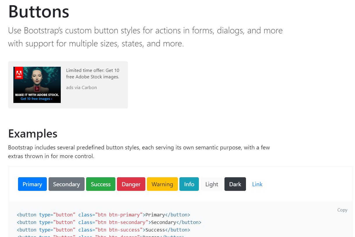 그러면 examples와 더 아래쪽에는 outline, size, active state 등 다양한 디자인을 선택할 수 있다. 우리는 그 중 맘에드는 모양의 코드를 복사하여 붙여넣기 하면 된다. 예를 들어 위 그림에서 빨간 버튼인 Danger 코드를 복사해 보자