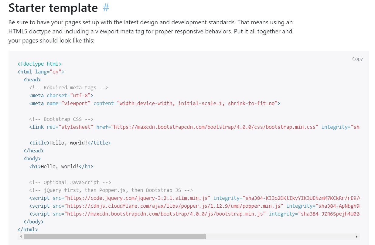 이 이외에도 자바스크립트나 jquery 라이브러리를 사용할 수도 있는데, 그때도 <body>안에 서식을 넣으라고 하기 때문에 처음에 시작할 때 홈페이지에 나와있는 Starter template를 적어두고 작업을 시작하는게 좋다