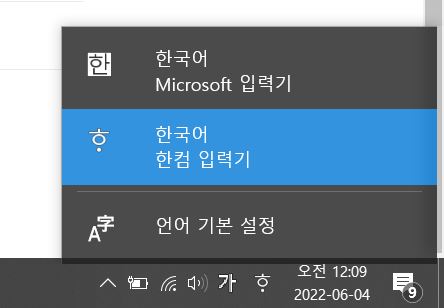 만약에 문제가 생겼을 때 ㅎ 버튼을 눌러보니 한국어 한컴입력기에 클릭이 되어 있는 상태라면
