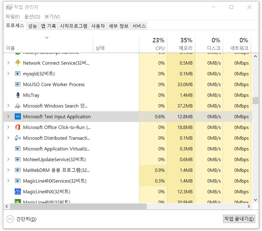 한국어 Microsoft 입력기로 변경했음에도 문제가 해결되지 않는다면 ctrl+shift+esc 버튼을 눌러 작업관리자를 열고 프로세스에서 Microsoft Text Input Application 을 작업끝내기하면 된다