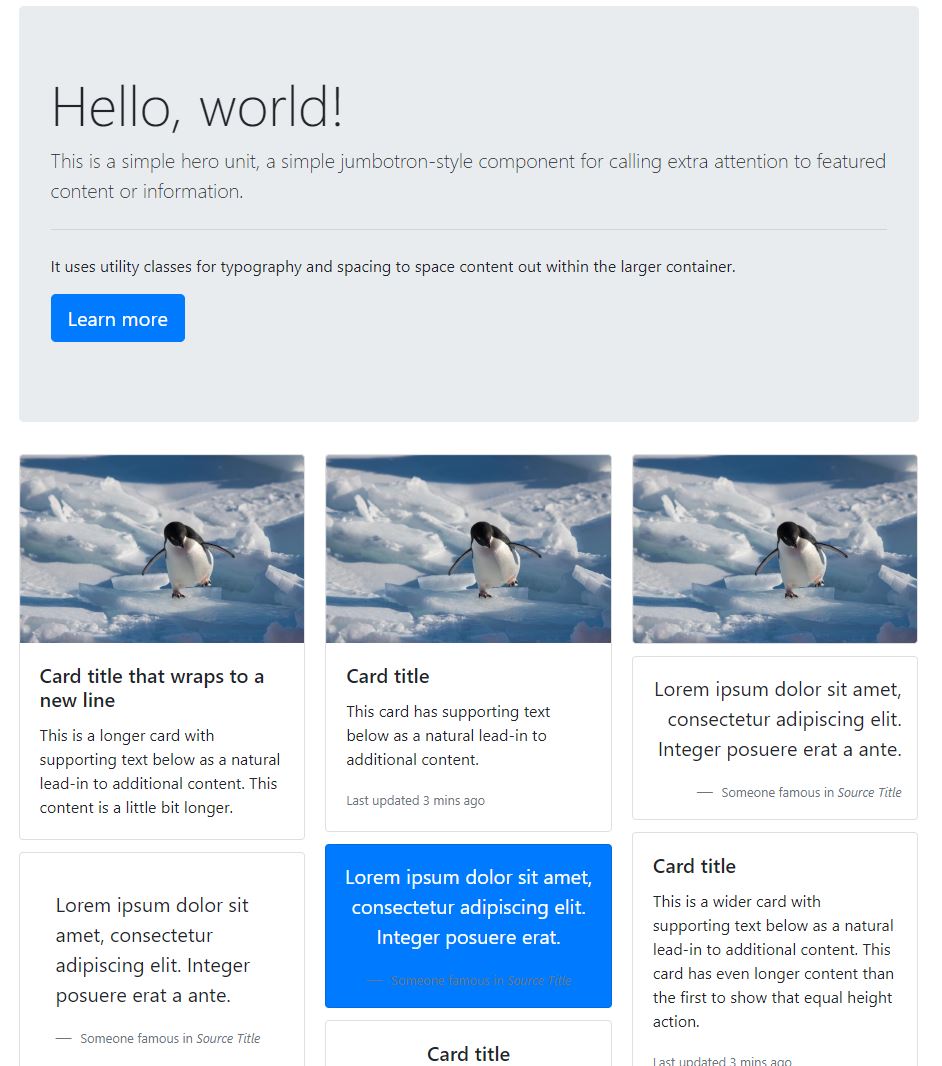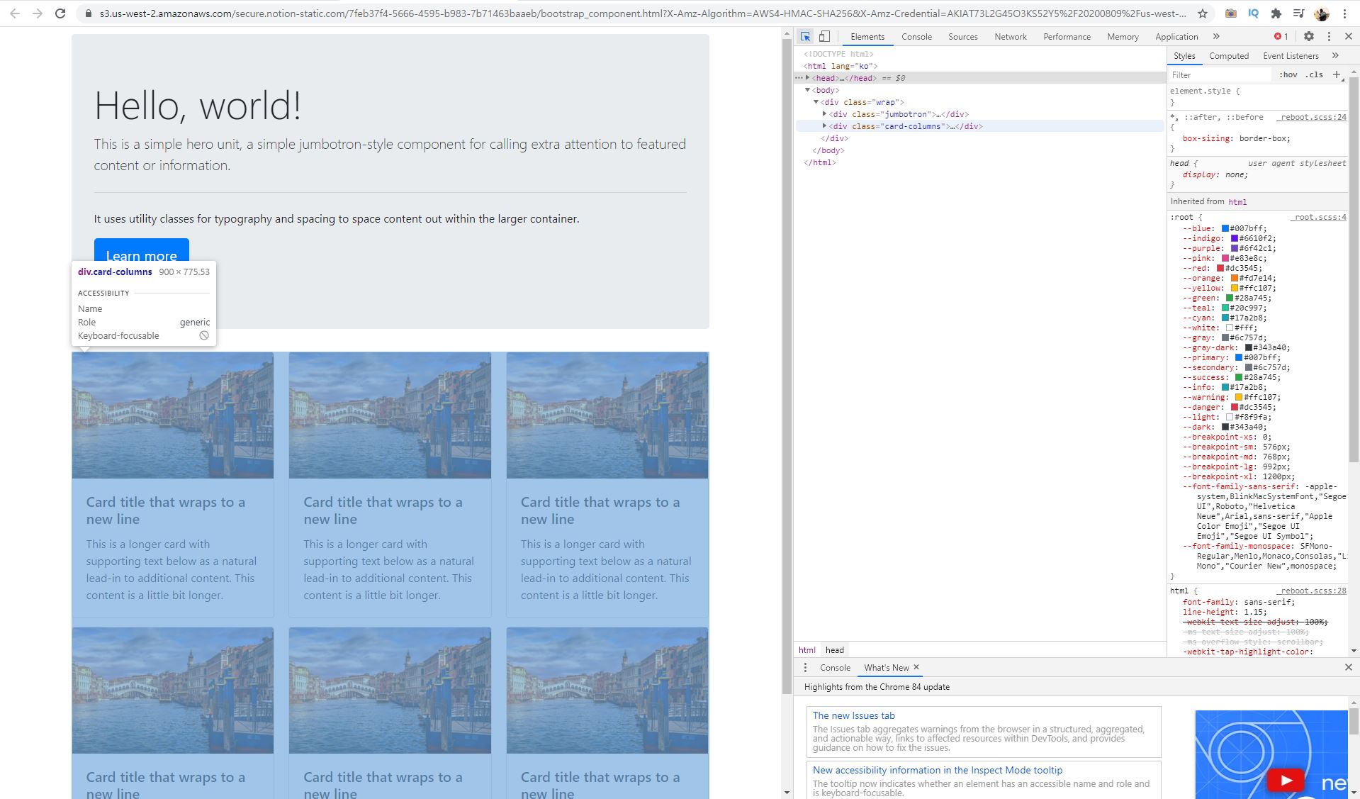 select로 화면을 클릭해 보면 윗쪽 부분은 jumbotron이고, 아래쪽은 card-columns로 이루어진걸 알 수 있다