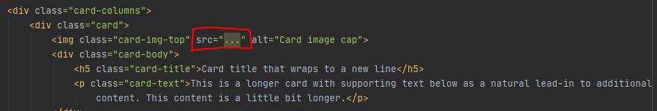그리고 사진이 나오지 않는 이유는, card-columns class 안에 아래와 같이 src 부분이 ...으로 되어 있어서다. 이 곳에 사진의 주소를 적으면 사진이 나온다. 사진주소는 구글에서 맘에 드는 사진을 검색하고 마우스 오른쪽 버튼 클릭 후 "이미지 주소 복사"를 한 위 ... 부분에 주소를 붙여넣으면 된다.