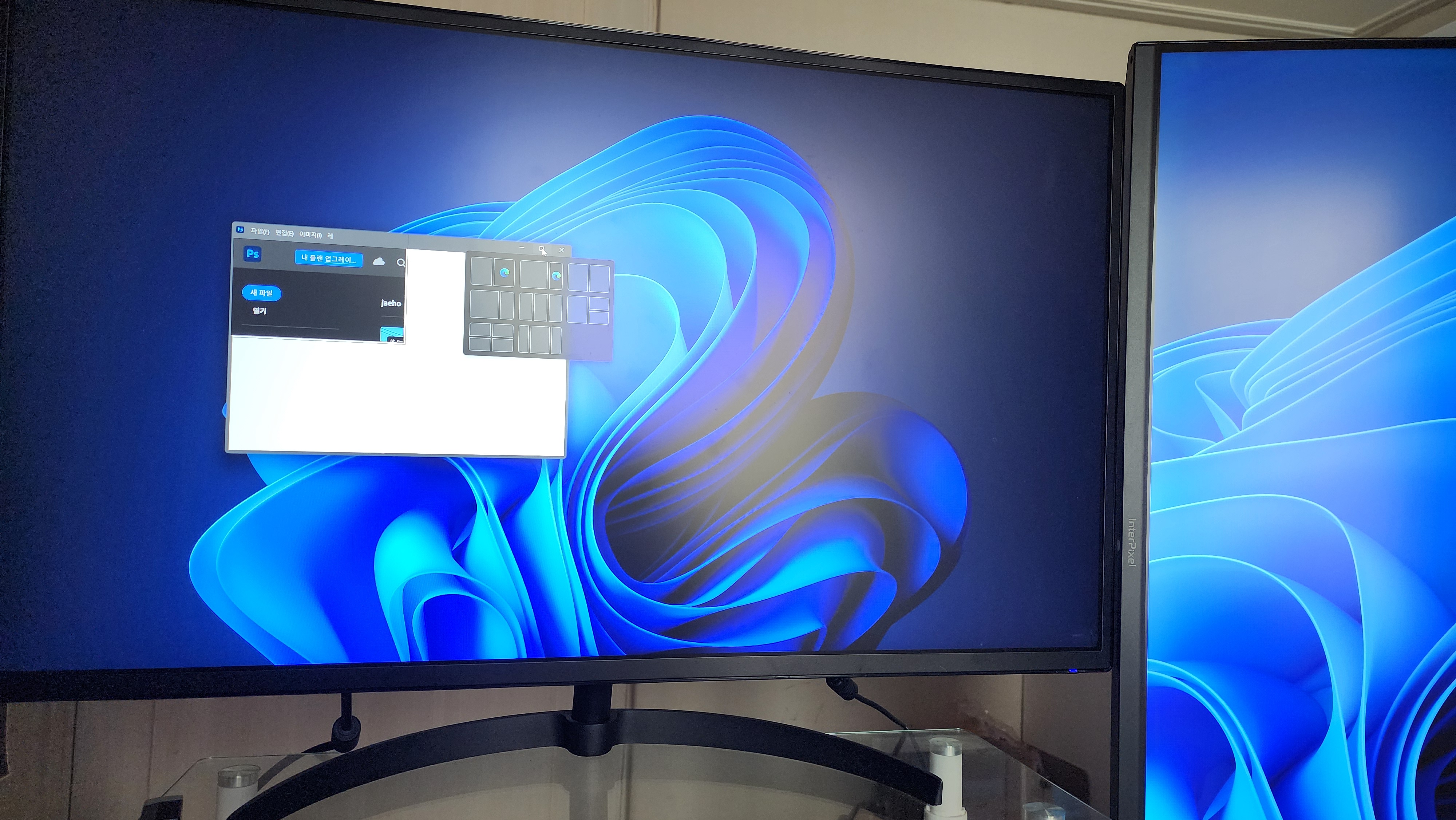 만약 화면을 거의 최대화에 비슷한 크기로 작게 하여 종료하는 경우는 다시 켤 때 다음 모니터로 포토샵 창이 넘어가기 때문에 종료버튼이 있는 세번째 모니터에서 위치저장을 하게 된다