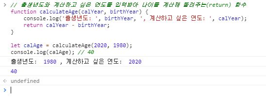 console.log('출생년도: ', birthYear, ', 계산하고 싶은 연도: ', calYear);