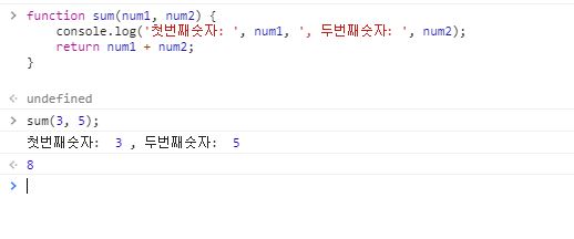 console.log('첫번째숫자: ', num1, ', 두번째숫자: ', num2); → sum 함수를 출력 할 때 '첫번째숫자:'라는 문자 뒤에 num1값을 출력하고, ',두번째숫자:'라는 문자 뒤에 num2값을 출력해라