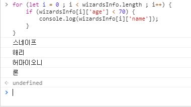 (wizardsInfo의 출력값 중 age의 값이 70미만이면 name을 출력해라)