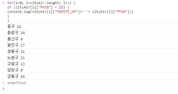 console.log(cityAir[i]["MSRSTE_NM"] + " " + cityAir[i]["PM10"]);