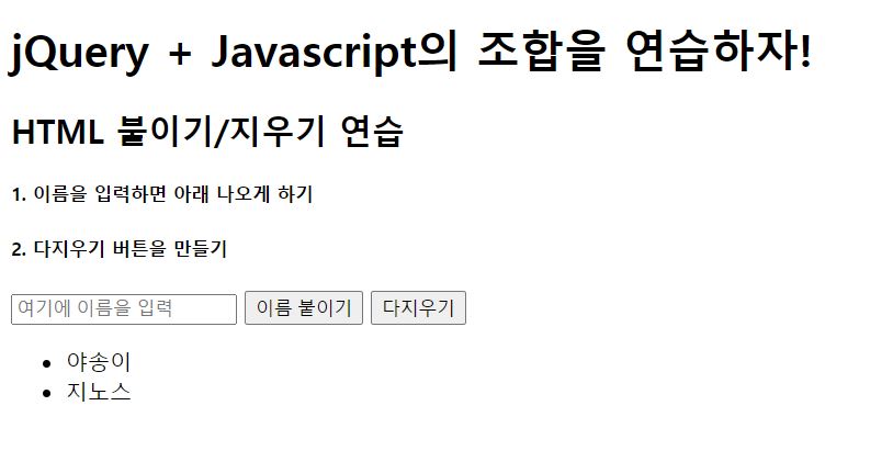 <h1>jQuery + Javascript의 조합을 연습하자!</h1>