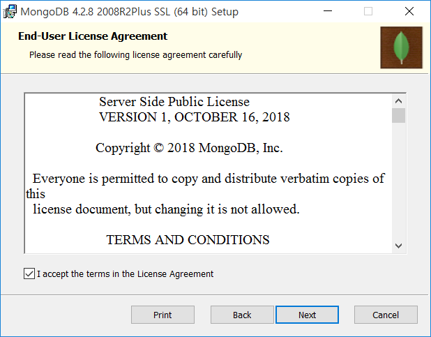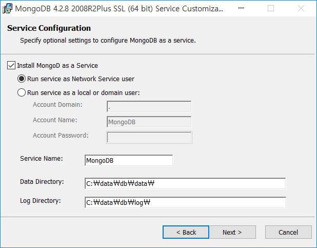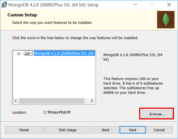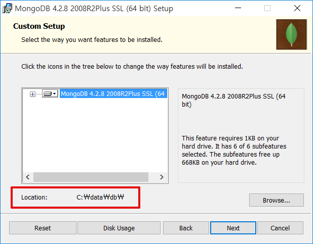 8. Location 항목이 C:\data\db\ 로 변경된 것을 확인하고 Next 를 클릭합니다.