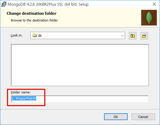 7. C:\data\db\ 를 찾아 선택하고 OK를 클릭합니다.