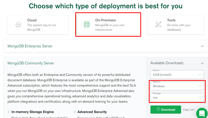 2. 링크로 가셔서, On-Premises 탭 클릭 > MongoDB Community Server 를 클릭하시고 다음 사항을 선택한 뒤 다운로드합니다.