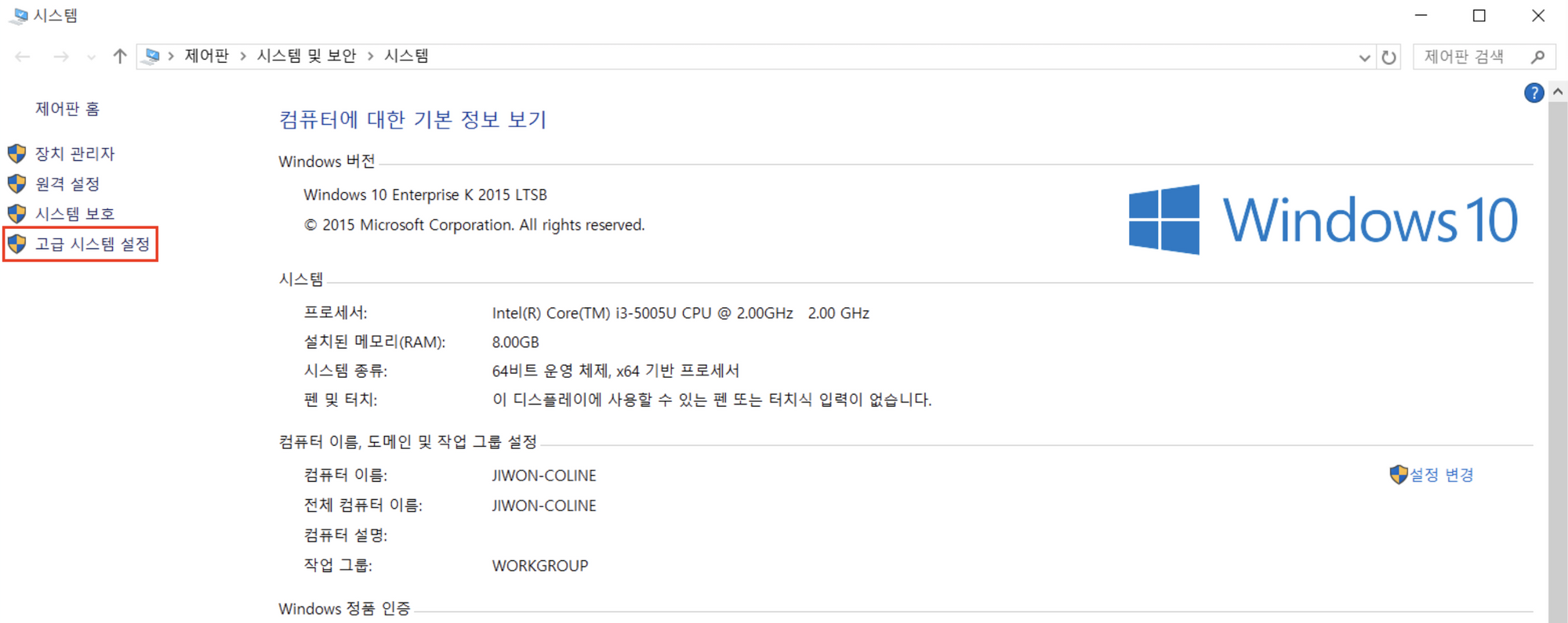 13. 제어판 > 시스템 및 보안 > 시스템 에서 [고급 시스템 설정]을 클릭합니다.