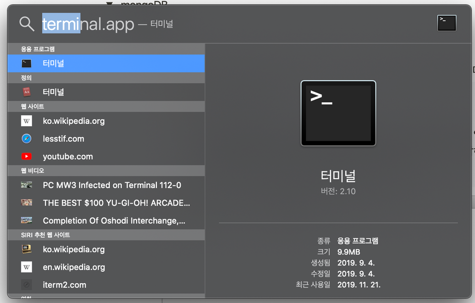 2. 터미널을 연다. spotlight 에서, "terminal" 또는 "터미널"로 검색하면 됩니다!