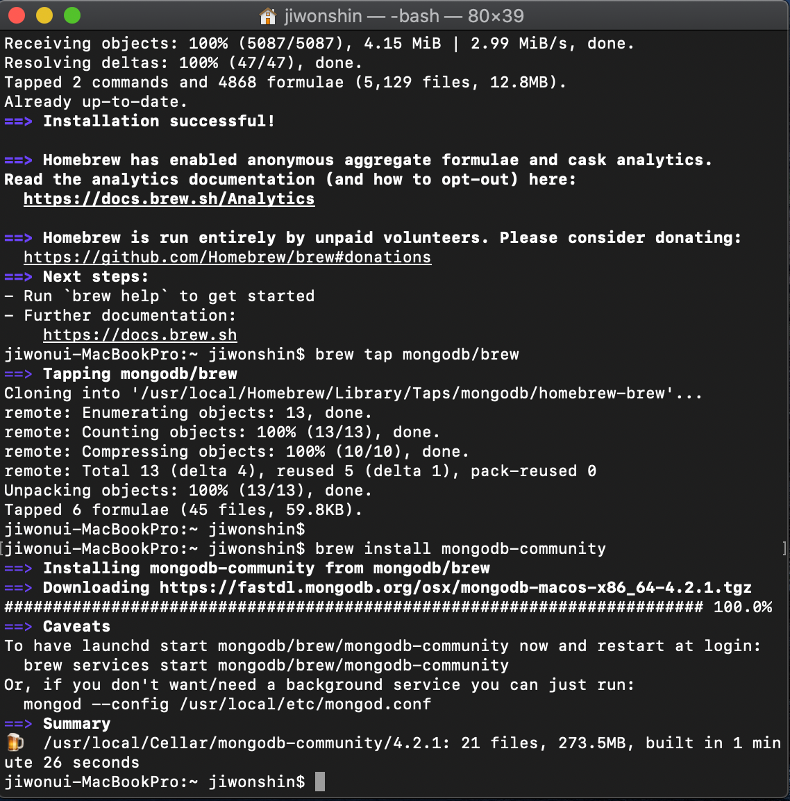 brew 라는 프로그램을 이용해서 MongoDB를 설치합니다. brew를 설치하실 때 반드시 컴퓨터 비밀번호가 있어야 합니다. 비밀번호가 없으신 분들은 맥북의 비밀번호를 먼저 설정하시고 진행해주세요.
