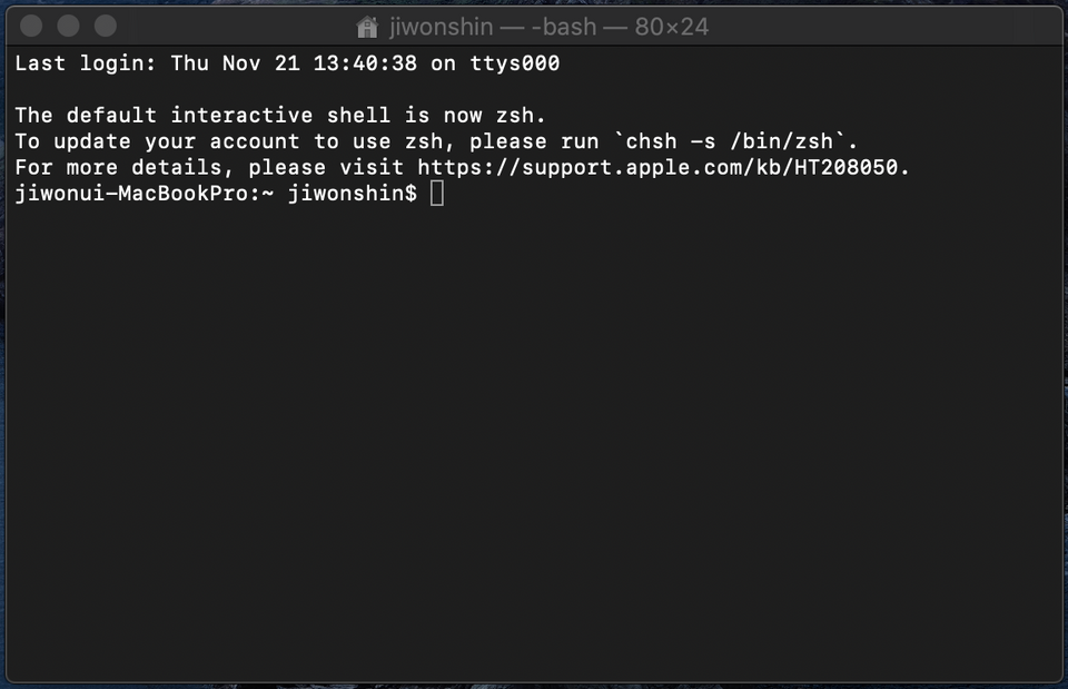 터미널이 무엇인가요? 우리는 주로 마우스를 써서 컴퓨터에 명령을 내리지만, 컴퓨터가 더 익숙한 건 '명령어'를 통한 명령입니다. 터미널은, '명령어를 쓸 수 있는 창'으로 생각해주시면 되겠습니다! 잘 여셨다면 아래와 같은 창을 만날 수 있습니다