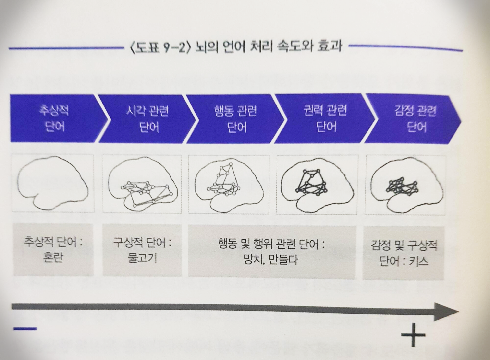 추상적인 단어일 수록 뇌가 덜 활성화되며, 동작 그리고 감정까지 같이 떠오르는 단어일수록 뇌가 활성화 된다